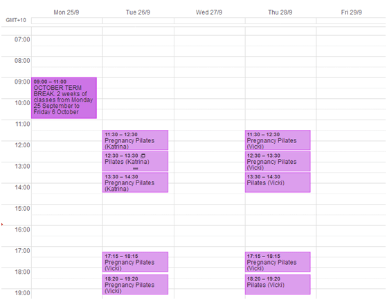04 Sep 2017 BY Katrina Tarrant POSTED IN Pilates, Sydney CBD Tweet Draft October 2017 Termbreak timetable Draft 'October term break 2017' timetable is subject to change. These classes will run for 2 WEEKS in our CBD clinic, falling on Tuesdays 26th September and 3rd October and Thursdays 28th September and 5th October, 2017. Classes are on offer only for our existing Fix Pilates clients. We have a mixed class scheduled for combined beginners/intermediate/advanced classes (called PILATES), and pregnancy-specific Pilates (called PREGNANCY PILATES). Classes are $41 each and must be paid for upfront for the 2 classes, total $82. Receipts will be issued for these 2 weeks for use when claiming with your private health fund provider. Check yours for eligibility. Tweet