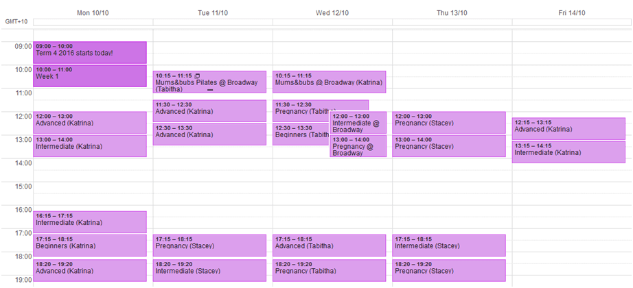 13 Sep 2016 BY Katrina Tarrant POSTED IN Pilates, Sydney CBD Tweet Draft Term 4 2016 timetable Draft term 4 timetable is subject to change. This timetable is for our all of existing and NEW Pilates clients. These classes will run for 11 WEEKS for all classes on Monday- Thursday, or 10 WEEKS for all Friday classes. Term 4 commences on Monday 10th October, and ends Thursday 22nd December. Classes are recommended and scheduled for: Beginners level Pilates Intermediate/advanced level Pilates Pregnancy specific Pilates Mums&bubs Pilates Tweet